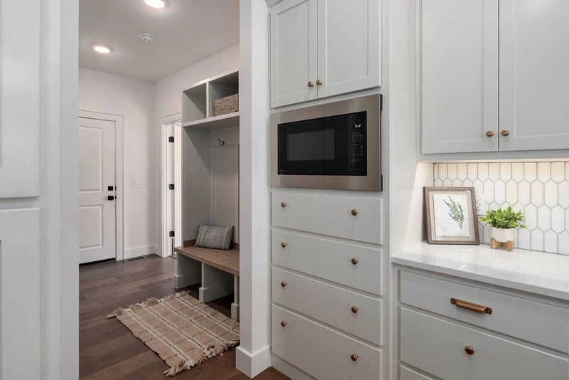 The Carter plan is designed with family living in mind, offering 3,400 sq ft of luxury, craftsmanship, and comfort. This all-brick home features custom cabinets, GE appliances, quartz countertops, and a vaulted ceiling in the living room, with a striking centerpiece fireplace. The main floor is designed for convenience, with a well-located hall bathroom, a mud bench for storage, and several closets for additional storage.
