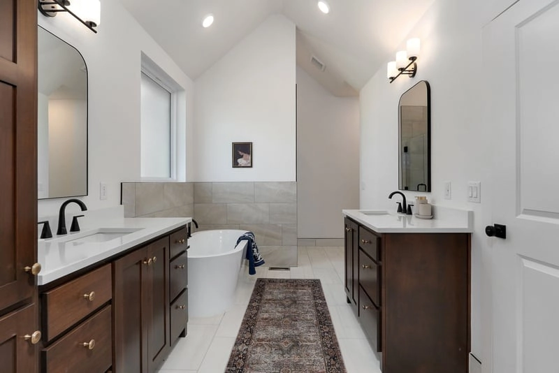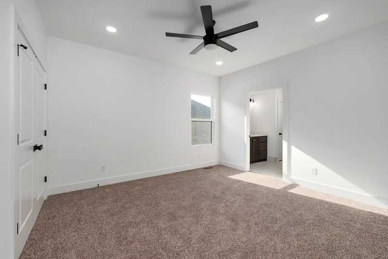 Upon entering, you’ll be greeted by a grand entryway that leads into the open kitchen, dining, and living space. The spacious living room is the heart of the home, offering an ideal area for entertaining. On one side of the living area, you’ll find the master suite, complete with a large closet, high box-up ceilings, and the largest master bathroom in our collection. This luxurious bathroom boasts over 10 feet of cabinetry, a beautifully accented tub wall, and a 4×8-foot shower with both a handheld and traditional shower head.