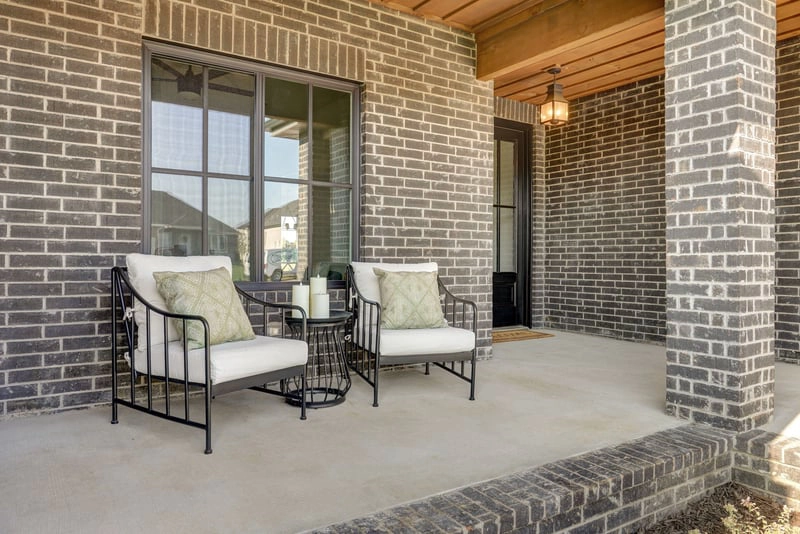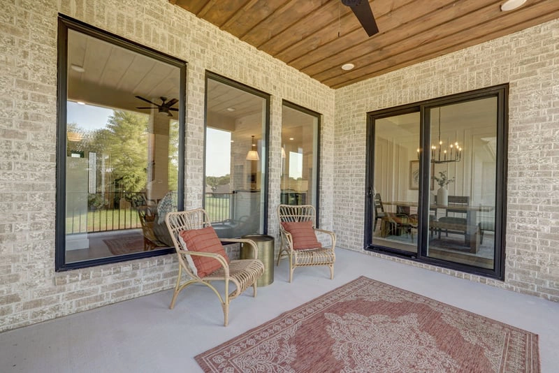 The Savannah offers a timeless design infused with modern touches, creating a stunning 2,544 sq ft home located in The Lakes at Wildhorse. From the moment you see its brick and stacked stone front porch and decorative beams, this home radiates curb appeal. Quaker black windows and a tall roof add to the appeal, while the back porch provides a peaceful space for relaxation. The rain glass-painted front door opens to a living, dining, and kitchen area with 11-foot ceilings, creating an open and airy feel.